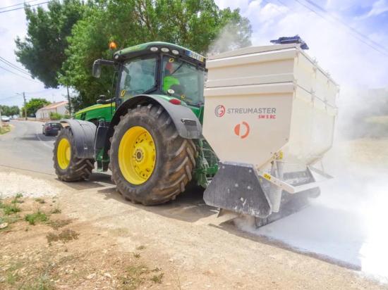 葡萄牙国立米尼奥大学(The University of Minho)负责为新的沥青稳定层设计混合料并从原有路面结构中采集样本。在这一过程中,他们发现路基仍有足够的承载力,相较于传统的、花费更高成本修建一条新路,修筑沥青稳定层加之一个新的沥青面层是一个也能够确保路面经久耐用的绝佳解决方案。为了修筑新的沥青稳定层,每平方米路面需要添加 7 kg 石灰。在拌合之前,石灰直接被撒布到原有路面上。借助其十分精准的、安装于约翰迪尔牵引车的 Streumaster SW 5 RC 粉料撒布机,石灰能够得到均匀的分布。通过谨慎地将材料按照正确的宽度撒布,机组人员获得了十分高的撒布精准度,从而使成本控制在最低范围内。