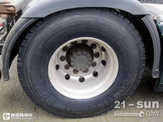 后桥则是采用了欧系牵引车主流的315/80R22.5的真空胎,同样更新了颜值更出众的铝合金轮圈,即便在今天的欧系卡车中也是高端的新典范。