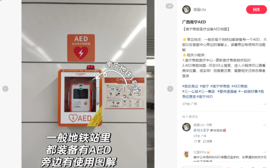 北京、广州、湖南、广西······来自全国各地的“安全巡查官”在三一基金会发起的小红书话题#救在身边里踊跃记录身边的应急避难场所和AED应急设备,通过个人分享将应急技能转化为公众的生活常识,合力绘制一幅持续生长的城市安全地图。