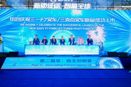 在新品重磅揭幕环节,中国工程机械工业协会工业车辆分会秘书长张洁,苏州汇川技术有限公司董事长朱兴明,三一集团高级副总经理、三一机器人公司董事长徐鹏飞,三一机器人公司常务副总经理、叉车项目总经理冯振礼,三一机器人公司副总经理、营销公司总经理胡柱、经销商与沙特大客户代表一起把象征绿色智能的充电枪嵌入启动台,共同为F7系列和三支点系列新品揭幕。