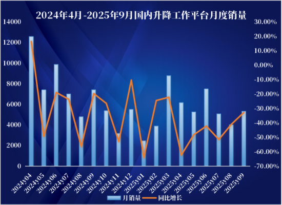 据协会数据统计,2025年9月当月销售各类高机(不含高空作业车,下同)12416台,同比下降23.8%,其中国内销量5334台,同比下降32.7%;出口量7082台,同比下降15.3%。