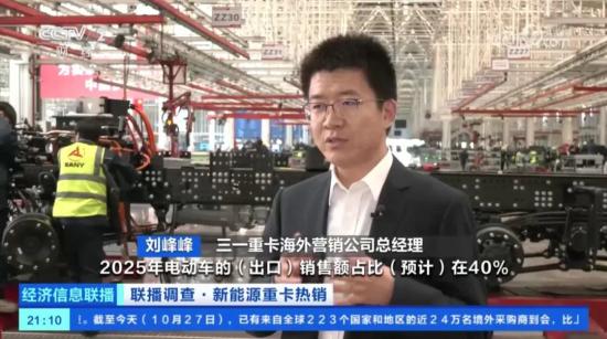 10月27日,中央广播电视总台财经频道(CCTV-2)龙头栏目《经济信息联播》推出专题调查,聚焦新能源重卡产业"旺季更旺"的发展态势。栏目组实地走访了三一智联重卡产业园及客户应用场景,深入解析这一绿色变革背后的产业逻辑。详细报道如下: