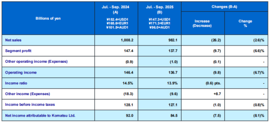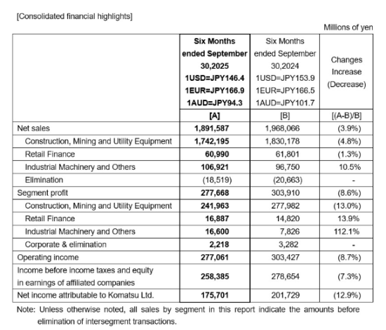 10月29日,株式会社小松制作所(以下简称“小松”)发布了2025财年第二季度(2025年7月1日至9月30日)合并财务业绩(美国通用会计准则)。受日元升值、销量下滑等因素影响,期内净销售额、营业利润等核心指标同比有所下降。