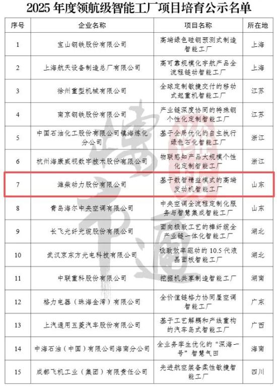 10月29日,国家工信部对2025年度领航级智能工厂项目培育名单进行公示。此次公示名单是国家工信部首批开展的领航级智能工厂申报项目,全国共15家,其中山东省仅有潍柴动力股份有限公司和青岛海尔中央空调有限公司2家。