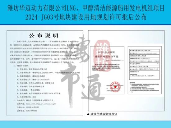10月30日,潍坊华迈动力有限公司LNG、甲醇清洁能源船用发电机组项目2024-JG03号地块建设用地规划许可批后公布。
