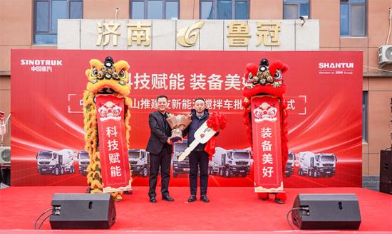 最后,山推建友代表将象征着信任与责任的新能源搅拌车钥匙交付给济南鲁冠,完美传递了中国重汽、山推建友专注产品品质、用心服务客户的铿锵誓言。