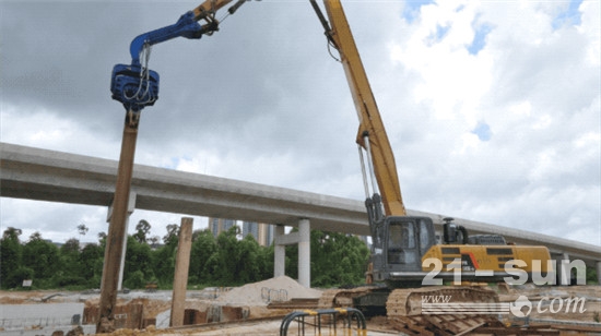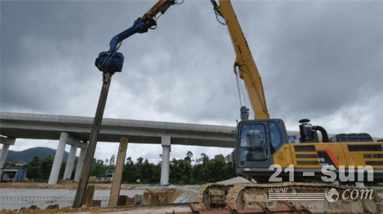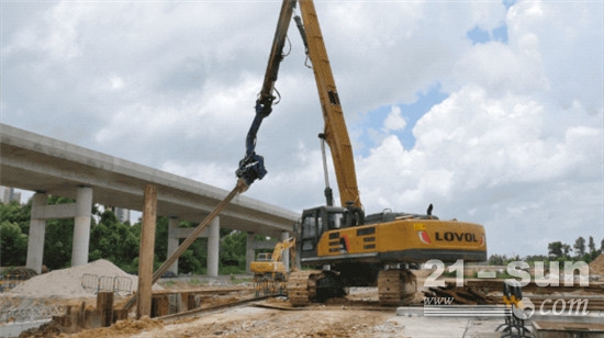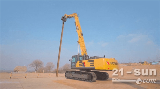 主要应用于城市道路管网建设、海洋围堰工程、山体护坡、起拔护筒等实际作业工况,特制加长臂、斗杆的FR550E2-PD打桩机具有先天的优势,在进行施工作业时,动力更加强劲,拔桩时游刃有余,特别是在需要护筒护壁的灌注桩,起拔护筒时,加长加大动臂的优势明显,作业效率出众。