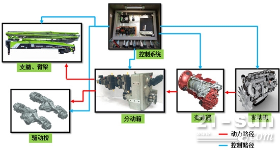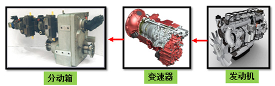 泵车的传动系统包括:变速箱、分动箱和传动轴,它就像是这个有机体的大动脉,把发动机发出的动力源源不断的传送到驱动轮、液压泵。如果这套传动系统性能不达标,就好比动脉中有了血栓,功率再大、动力再强劲也无法让混凝土源源不断的输送。因此一套成熟可靠的动力传输链,是确保混凝土作业顺利进行的关键。