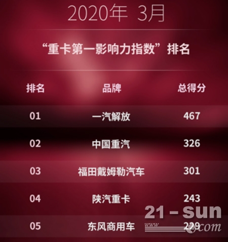 2020年3月,根据权威媒体多维度评测,最终得出国产重卡影响力指数,一汽解放以467分的总得分夺魁,中国重汽以326分位居榜眼。而这两家企业正是中联重科国产底盘泵车的供应商。