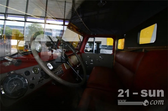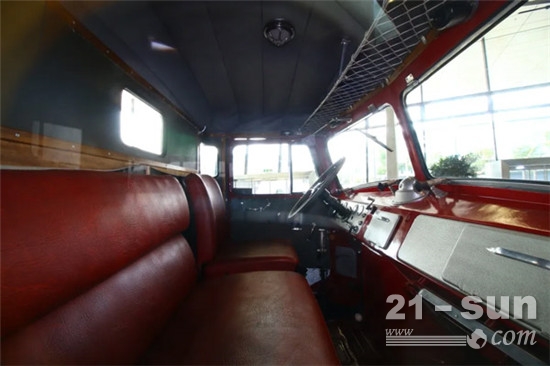 透过玻璃观察一下驾驶室内部,酒红色的内饰与车身外观颜色相同。古朴的直线条仪表盘功能少得可怜,只有行车所需的必要信息,例如时速表、气压表等等。