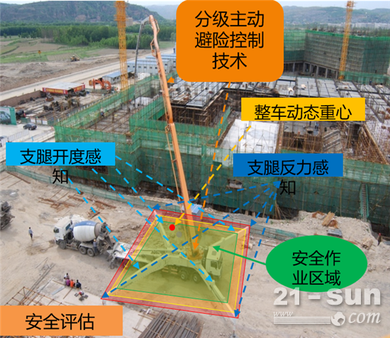 防倾翻技术主要是通过各种技术手段避免泵车发生侧滑事故。中联重科经过10多年持续研究开发了全新第三代基于“等效重心法”的防倾翻技术,避免操作臂架作业时整车重心超出支撑安全区域而产生的倾翻问题。可适应任何复杂地形,检测精度高,经过大量的试验表明判断错误率为零,分级控制、控制延时低、效果有保障,牺牲的作业区域最小,在保障整车安全前提下,实现可布料作业区域的最大化。
