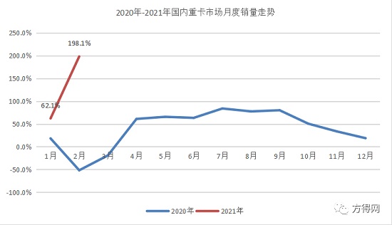 2021年2月的重卡市场延续1月的运势持续保持上扬,预计上涨198.1%,给我们带来了“惊喜”。
