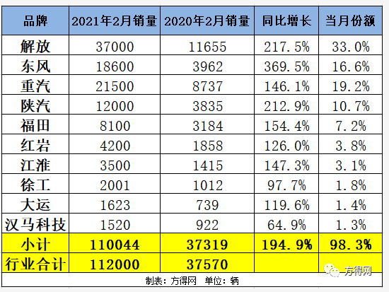 从前10强重卡企业透露的数据来看,2021年2月,国内重卡市场整体销量预计11.2万辆,同比暴涨198.1%。