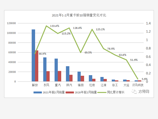 从单月销量来看,2月,有4家前10强企业销量破万辆。数据显示,2月,解放、东风、重汽、陕汽,4家企业重卡销量分别为3.7万辆、1.86万辆、2.15万辆、1.2万辆,前5强份额合计86.7%,夺走3/4以上市场。其中,解放、重汽,两家企业销量均超2万辆,两家企业份额合计达52.2%,占去市场份额1/2。值得一提的是,2月,解放表现非常亮眼,以3.7万辆的市场表现拿下2月销量榜冠军,而且同比大涨217.5,成为2月增幅第二。