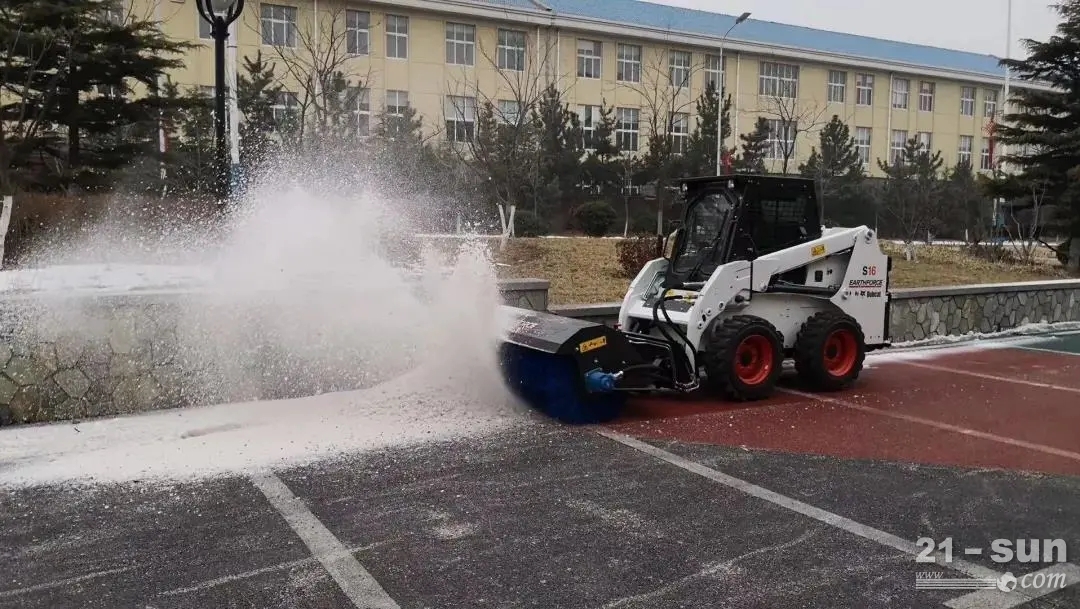 另外,雪天除雪可以由山猫滑移搭载斜角清扫器来处理,采用高扭矩马达,液压作业,能够高效清扫路面上的积雪、尘土和其他碎渣,配备大直径刷片,道路边缘和转角也能覆盖。无论何时何地,都能在在下雪后第一时间迅速开辟出一条畅通无阻的路,帮助恢复交通秩序。