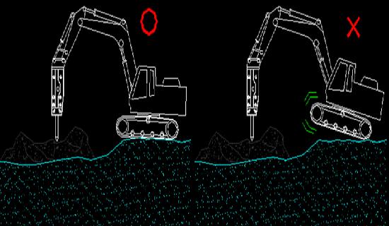 1.使用挖掘机机械臂给破碎锤施加压力, 使得破碎锤能稳稳地顶在打击物上。但不要过多地给破碎锤施加压力甚至将挖掘机顶起来。