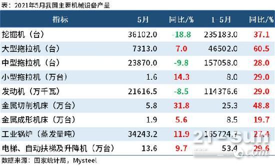 国家统计局最新数据显示,2021年5月挖掘机产量36102台,同比下降18.8%;1-5月累计产量235183台,同比增长37.1%。挖掘机产量同比增速已连续2个月下滑。