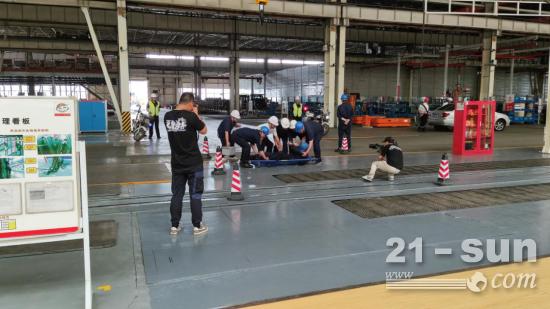 现场组织机械事故应急演练,模拟三一设备钢丝断裂重物伤人、人员触电的救援行动。