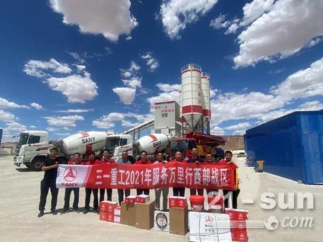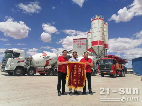 2021年7月7日,戈壁气温38.5摄氏度,西部战区司令贺电,三一重工搅拌站研究院、泵车研究院、搅拌车研究院设计人员、甘肃服务万里行巡检小组一行16人在沙漠无人区驱车4个小时抵达东风航天城东风一凡搅拌站。