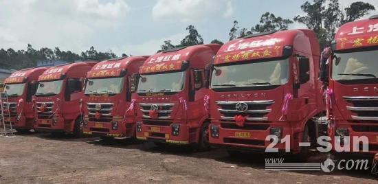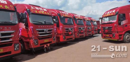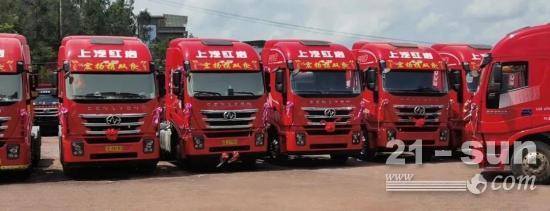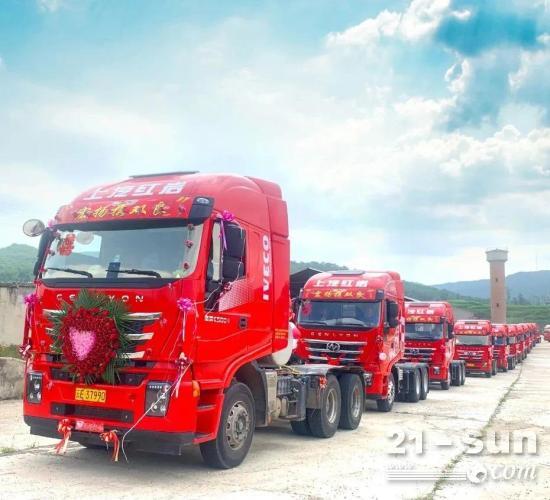 数十辆大红色红岩重卡列阵排开,场面恢宏,发动机的轰鸣远比豪车的引擎更带劲。