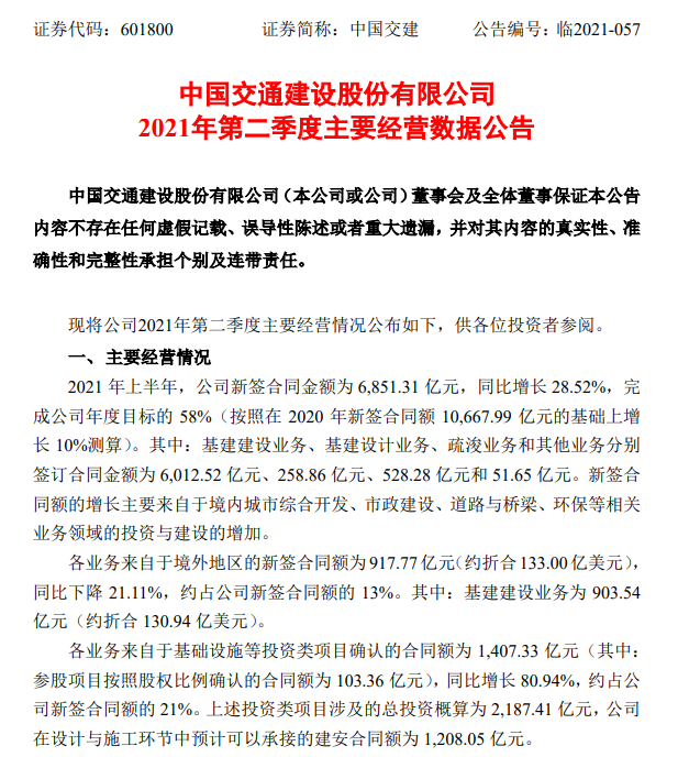 2021年上半年中国交建具体中标情况究竟如何,有何亮点呢?