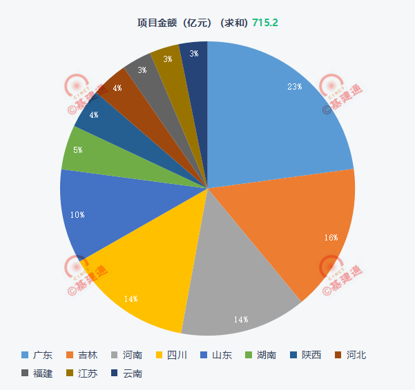 上述重大项目主要分布于 11 个省份,其中以广东省项目份额最重,达 23%即约163.6 亿元。