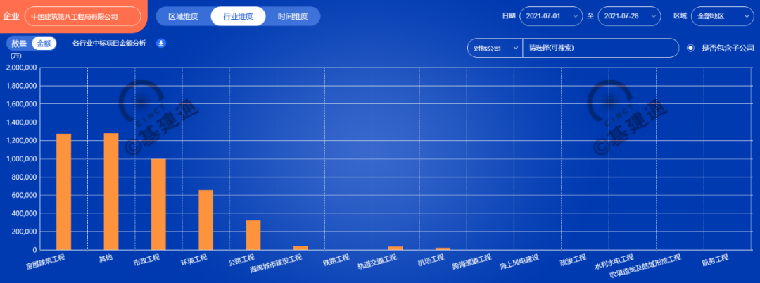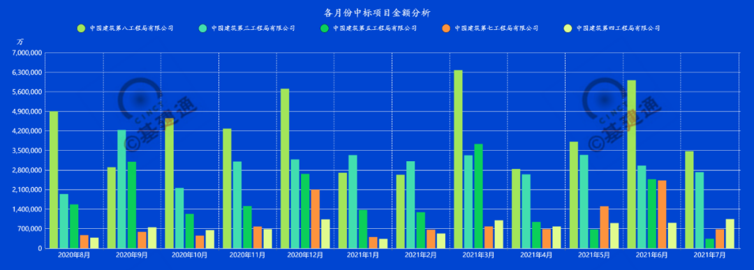 另外,经基建通 AI 经营管理云平台数据库统计,中建八局在 7 月份中标项目额在 350 亿元左右,与其他二级单位相比,其中标项目总额也处于领跑趋势。