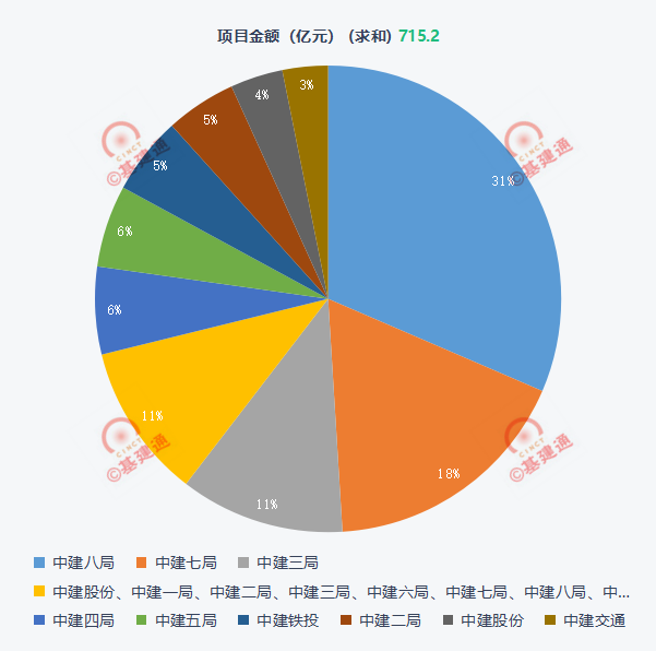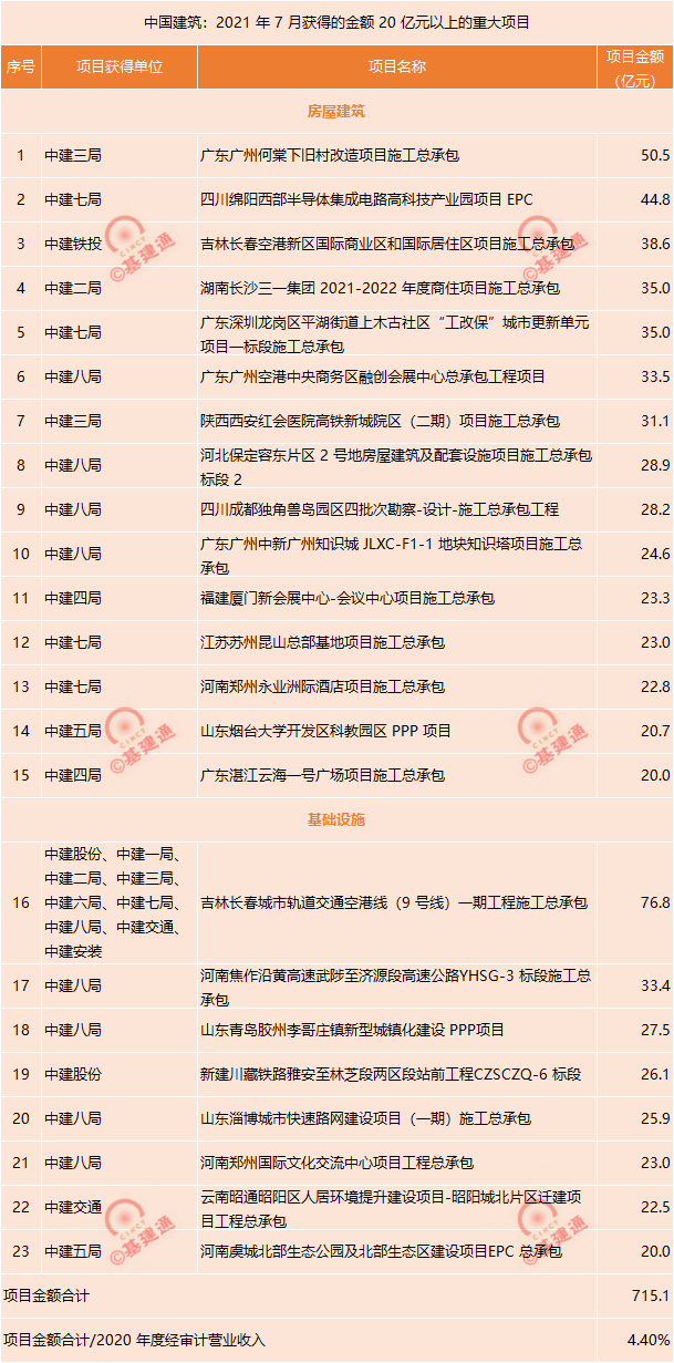 昨日,中国建筑发布最新企业公告显示,近期公司斩获23 项重大项目,累计合同额约715.1亿元,占其 2020 年度营业收入的 4.4%。项目的获得单位主要来自中建八局、中建七局、中建三局、中建四局、中建五局等其他二级单位,具体的项目清单如下: