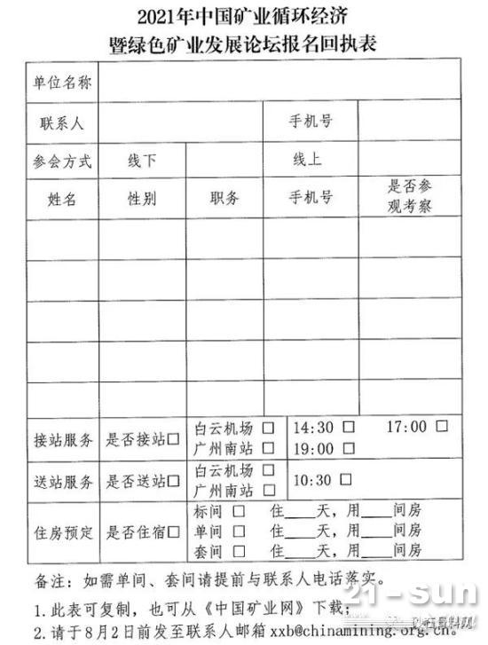 线下参会嘉宾请同时将报名回执表(见附件1)填写完整后发送至邮箱xxb@chinamining. org. cn,报名截止2021年8月2日。