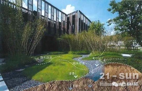 场地设计利用绿化缓坡收集净化雨水,建立植被缓冲带减少污染,采用乡土植物降低水的消耗