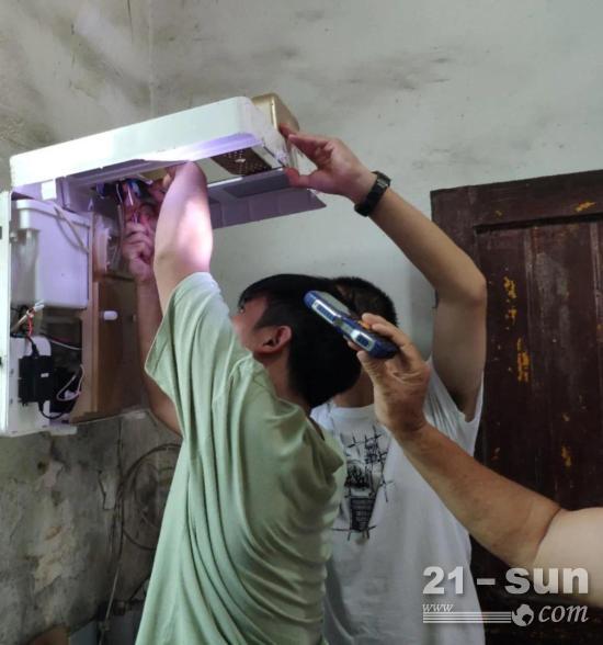 7月20日,利用所学的专业知识与技术,志愿者们对贺畈社区居民的家用电器进行检修。在王爷爷家中,经过志愿者们的努力,原本无法使用的净水器已“宛若新生”。