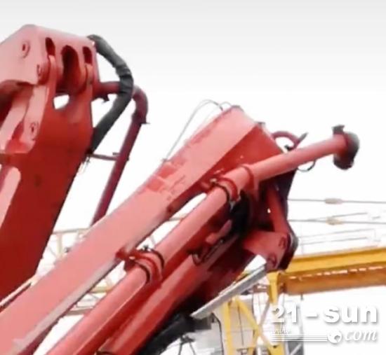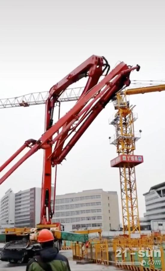 泵友@泵车小乐分享:支撑还没有打完,塔吊没有升太高,突然一声巨响,塔吊直接把泵车臂架干断了…这下是真的360°横着打!