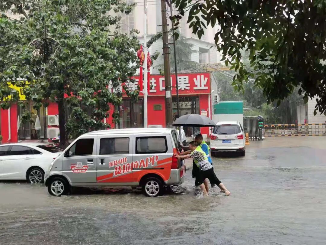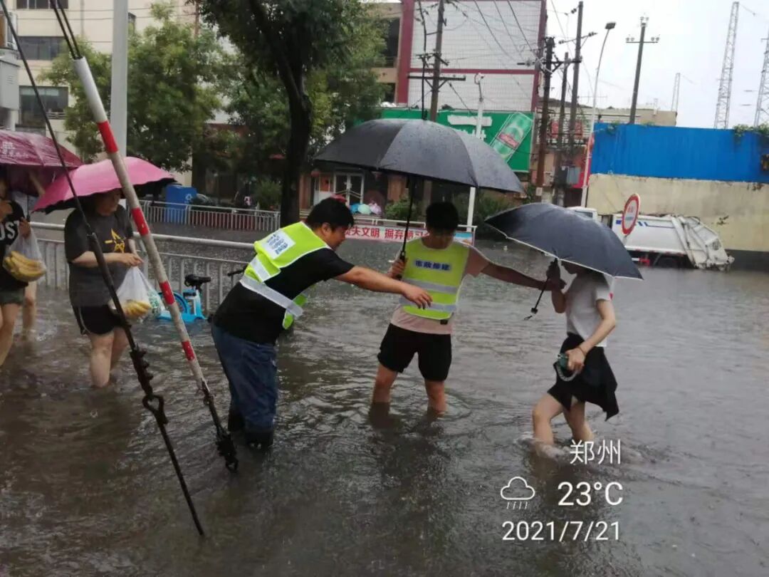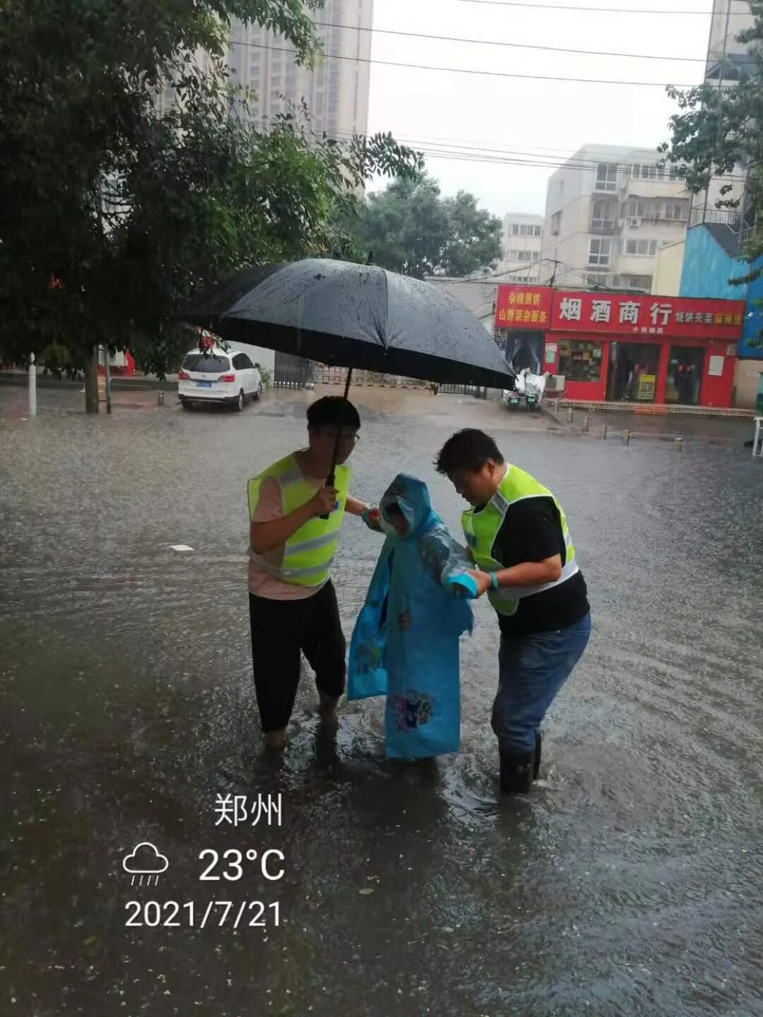 最后,回到默默无闻一直坚守做好后勤保障工作的各职能部门。工程管理部主任李洪征从19日开始,通过公司微信群多次及时发布天气预报预警信息,做好上情下达工作,及时布置公司防汛值守工作,通知人员上岗,并带领大家坚持在一线参与值守。在二环支路值守点,雨水已超过值守点人员腰部,两侧道路均被大水封闭。党员宋军山同志和部门蒋智新在值守点坚持值守4小时,期间有电动车倒在人行道上,两人又及时将电动车转移到门店台阶上。公司安全部资深党员王文超同志一向热衷爱心事业,带领部门人员在值守点组织交通,帮熄火的车辆推至安全地带,他们不断提醒路人远离路灯及线杆,防止出现触电危害人员安全情况。在福寿街中原路值守点,财务管理部周超和杨振在此值守,此时中原路隧道已无法通行,两人提醒过往人员绕道通行,期间有一女子车辆停在地下道进口处,执意想把车开出来,被两人和路边辅警及时制止。