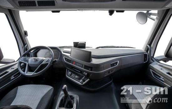 高顶驾驶室,宽大的内部空间,双卧铺、下卧铺宽度高达了840mm,同级别车型中行业最宽,全新内饰设计、符合人机工程的空间布置,全新仪表台、空气座椅、多功能方向盘、10寸中控大屏等配置,提升驾乘舒适性。