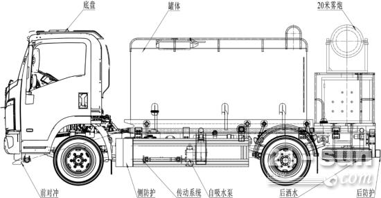 本清洗车主要由专用车底盘、罐体、水泵、传动系统、喷洒管路系统、安全防护装置等组成(见图1)。
