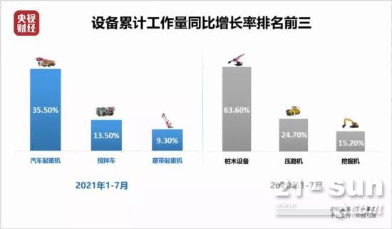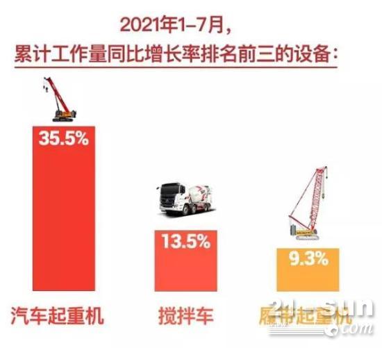 2021年1-7月,累计工作量同比增长率排名前三的设备:汽车起重机(35.5%)、搅拌车(13.5%)、履带起重机(9.3%);