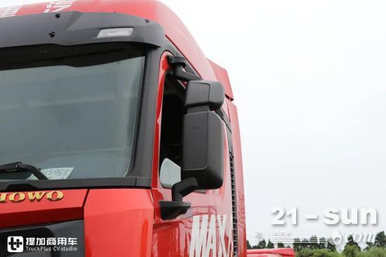 一体式的后视镜在设计上不同于大部分国产车,豪沃MAX重卡采用的是一个副镜在上的布置方式,采用大斜度和大曲率的镜片,对车辆盲区的观察更为方便。