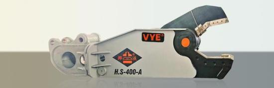 “潍液”“VYE”H.S-400挖掘机液压剪,鹰嘴剪,分大臂型和小臂型。适合安装于28吨-33吨各品牌挖掘机大臂使用,或33吨-45吨各品牌挖机小臂使用。剪头自重约5800公斤,总长度约4.38米,高度约1.8米。剪刃部最大开口约82cm,喉口深度约87cm。剪切力280吨,可剪切重型报废运输车辆车架,钢构车间梁柱,H钢500#,板材直剪厚度35mm,挖开25mm。