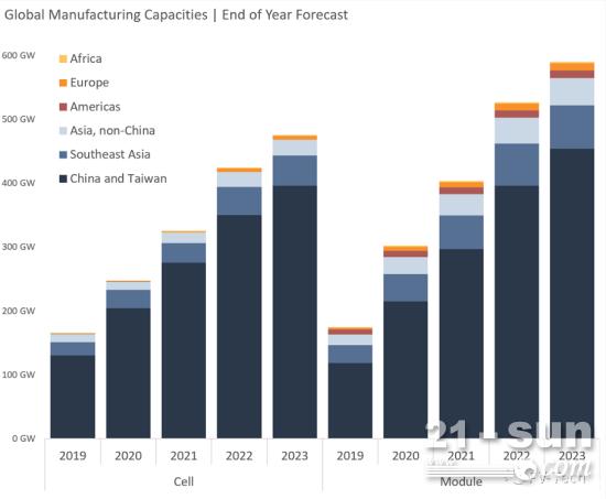 通过调查和采访,CEA光伏供应商市场情报计划报告(二季报)对太阳能行业头部制造商进行了深入分析。据预测,中国大陆和中国台湾地区的产能水平仍保持最高,共占全球电池产能的85%以上,在全球组件产能中的占比约为75%。