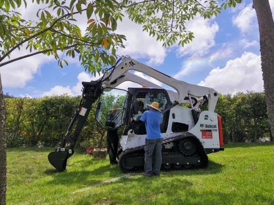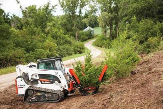 山猫移树机,专为高效和经济的操作而设计。对于动力强、垂直举升高的山猫T770来说,更是小菜一碟。液压控制的可张开式刀铲,使操作手几乎能从任何角度接近树木,从而切割树根,快速压挤根部土包,同时可将直接树球运输到拖车上,保证土球对根系的水分供给,提高成活率。