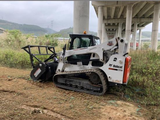 山猫T770搭载草木切割机,它具有双重刀刃和强大的切割力,可以修剪最难对付的杂草和树丛,切断直径达7.6cm的灌木和小树。悬挂连接使得该附件能够更好的贴紧地面,它可摆动的盖板使其可以贴合不平整的地面甚至在斜坡上进行割草作业,获得流畅、稳定、高质量的切割效果。