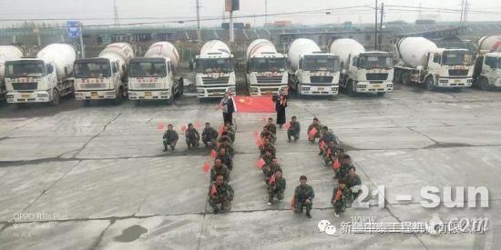 沙湾金泽建材公司员工团队在三一搅拌车前合影