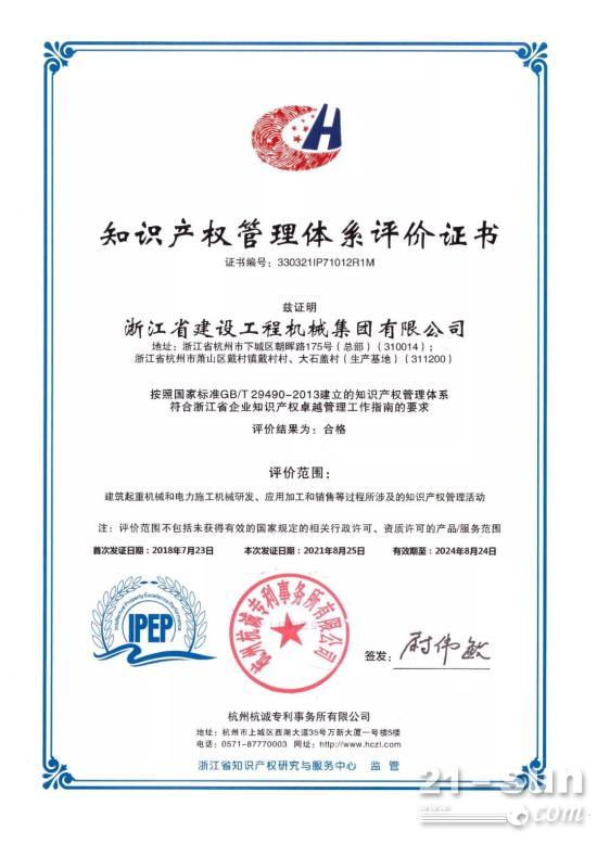 近日,浙江建机集团顺利通过浙江省企业知识产权卓越管理第三方评价复评。