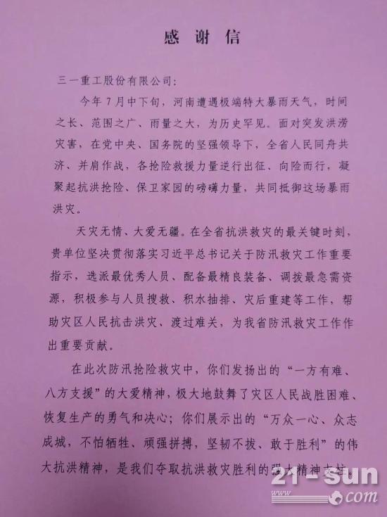 近日,三一重工收到了一封河南防汛抗旱指挥部发来的感谢信。