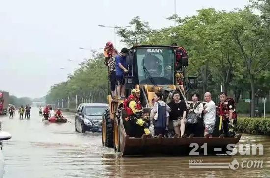 在洪水淹没的街道和乡间,随处可见救援官兵使用三一铲车等工具运送被困人员与物资,每天来回往返无数趟,帮助乡亲们渡险。