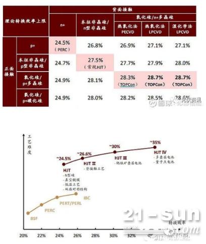 综上 , 从转化效率上看 , TOPCon和HJT在实验室效率和量产效率上均无明显差异 , HJT在远期的理论转换效率上可叠加叠层和钙钛矿技术均有明显优势 , 但该优势至少需要三到五年才能有实际体现 。