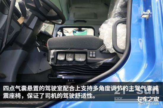 四点气囊悬置的驾驶室配合上支持多角度调节的主驾气囊减震座椅,保证了司机的驾驶舒适性。