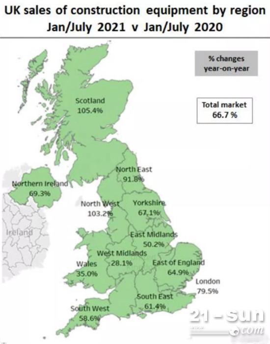 英国工程机械协会(CEA) 发布的最新数据显示,英国工程机械设备目前的销量高于2019年同期水平。2021年7月英国设备销量比2020年同期高出31.4%,2021前7个月累计销售设备22,000 多台,比2020年同期增长66.7%。考虑到核心零部件的供应限制等因素,目前的市场表现显示了英国市场的潜在实力。