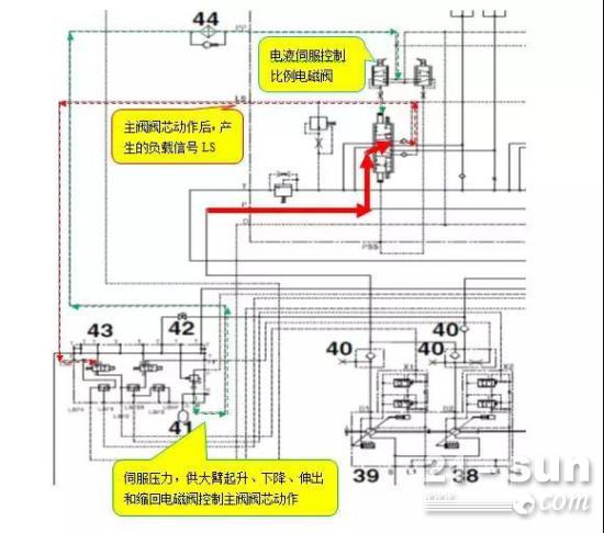 由下液压原理图分析可知:变量柱塞泵需要主阀阀芯动作,得到负载压力产生负载信号LS激活后才能工作。而主阀阀芯动作需要伺服油压推动主阀阀芯,因此负载信号LS和伺服压力能否正常运行是大臂正常运作的条件。