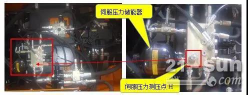 接着维修人员进行液压压力测试,发动设备后用60bar量程压力表进行测量,确认液压表和测压管线是否正常。首先测量液压系统的伺服压力,测量结果显示伺服压力为0bar,而正常机车的液压系统伺服压力应为35bar±5bar。测试点如下图所示: